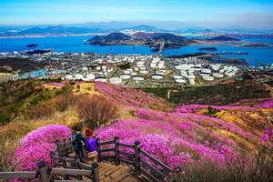 영취산靈鷲山(510m) 전남 여수 영취산은 나지막하지만 산세가 힘찬 산으로 거대한 불가사리 같은 모양의 준수한 산릉이 사방팔방 뻗어나가 있다. 이 중 서릉에 형성된 군락을 정상 군락지, 동릉 상의 길쭉한 암괴인 개구리바위 북사면 일대를 개구리바위 군락지, 그 동쪽 골망재 근처 능선 북사면은 골망재 군락지, 돌고개 근처는 돌고개 군락지, 그리고 정상 남쪽 봉우재에서부터 시작되어 시루봉 정상까지 펼쳐진 진달래밭은 봉우재 군락지라 부른다. 넓은 대로인 17번국도, 77번국도, 그리고 공단도로 등이 이어지며 빙 둘러싸고 있고, 도로변 여러