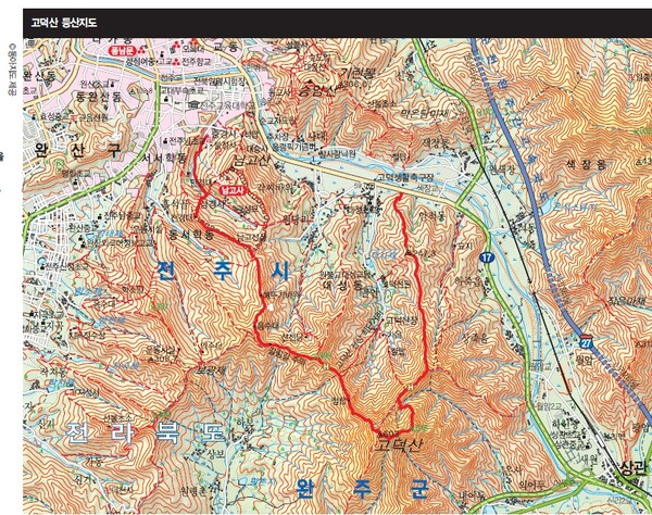 고덕산은 도심에 가까이 있어 등산로가 다양하고 산행과 동시에 역사 탐방을 겸할 수 있을 정도로 볼거리가 많다. 시민들이 많이 이용하는 생활권 등산로답게 길은 매우 양호하다. 다만, 갈림길 이정표에서 방향 표시가 혼동되어 주의해야 한다. 역사 유적 탐방을 목적으로 전주교육대학교 뒤쪽에서 남고산을 오르는 코스를 많이 이용한다. 남고산성길과 남고사를 중심으로 이정란 장군을 모신 충경사, 조계종 초대 종정 효봉스님이 경치에 반해 이름을 지었다는 삼경사三景寺, 삼국지의 관우를 모신 관성묘가 있다. 특히 충경사는 임진왜란 때 의병장 이정란의 공적을 기려 세운 사당이다.
